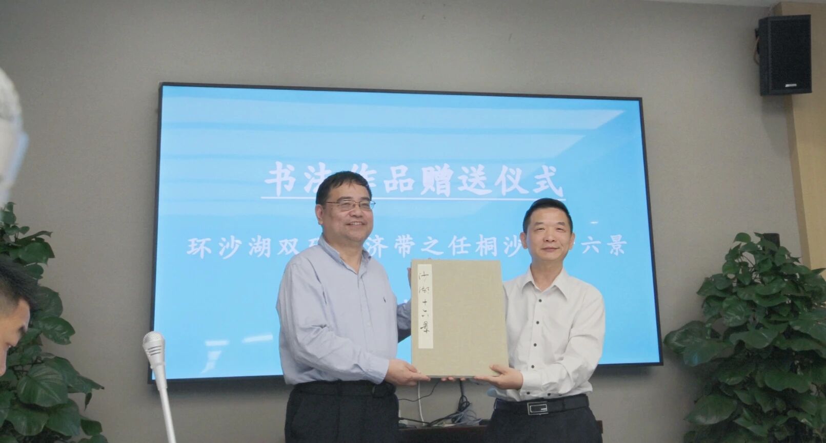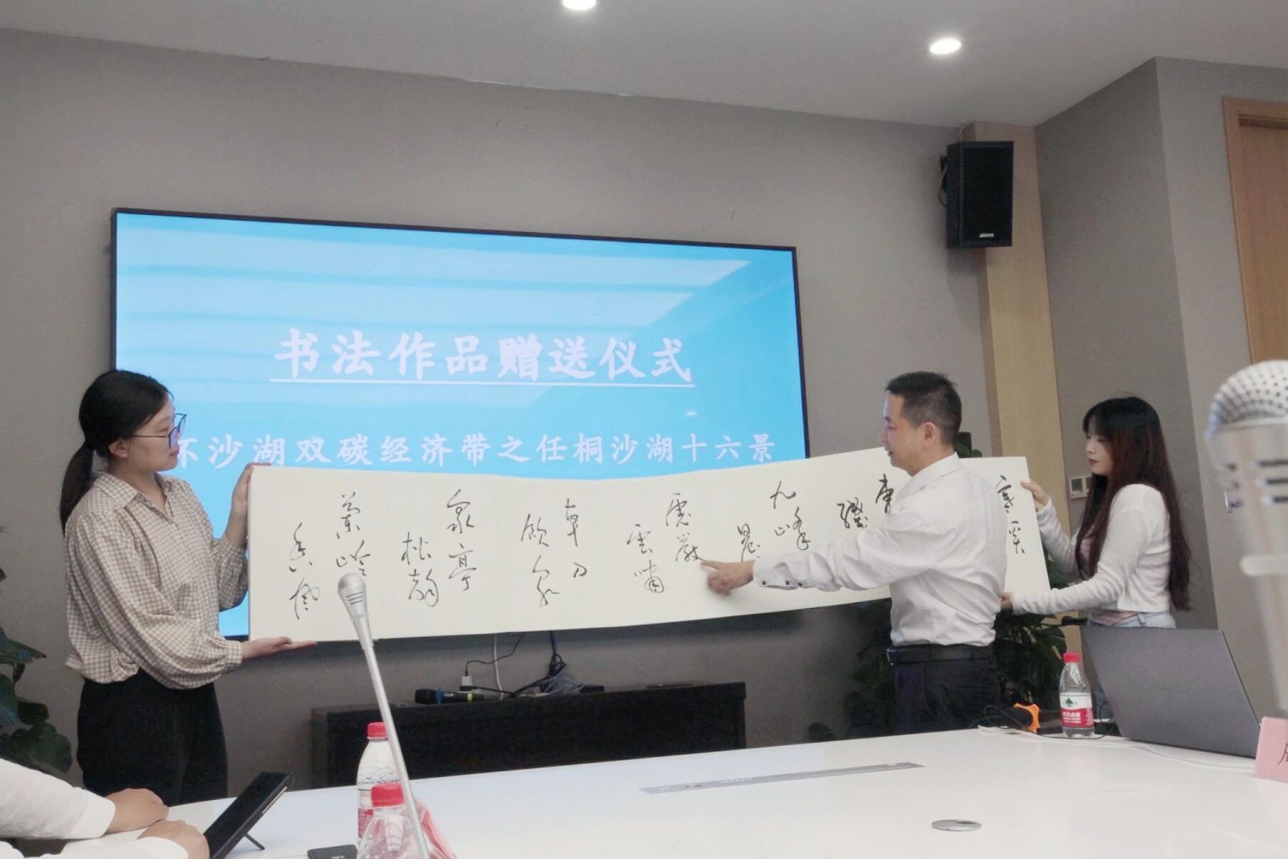 活动中举行了富有文化气息的环节。武汉市创业天使导师肖胜虎将其创作的生态文明主题书法作品《环沙湖双碳经济带之任桐沙湖十六景》赠予武碳院。